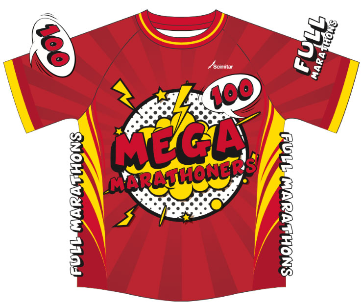 Striking red Mega Marathoners Full Marathon Short Sleeved Shirt!