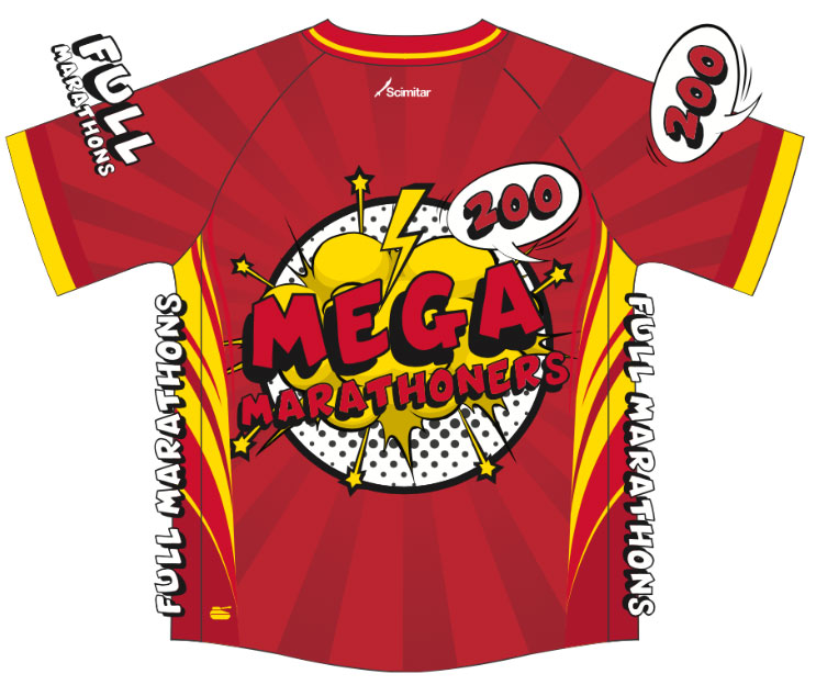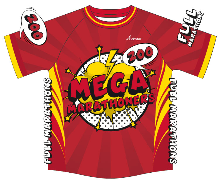 Striking red Mega Marathoners Full Marathon Short Sleeved Shirt!