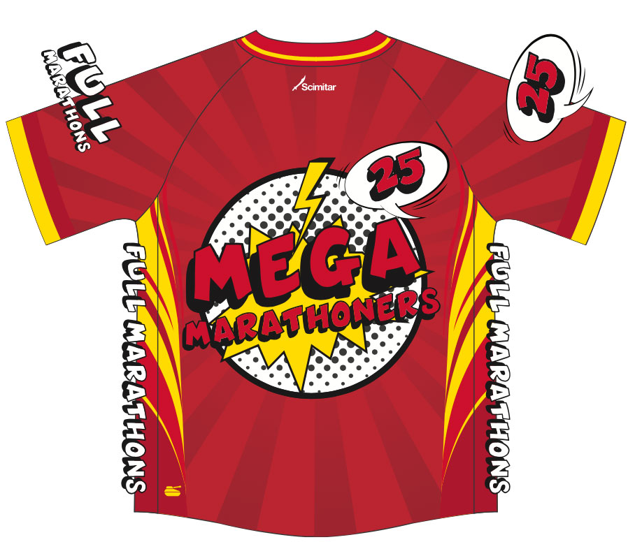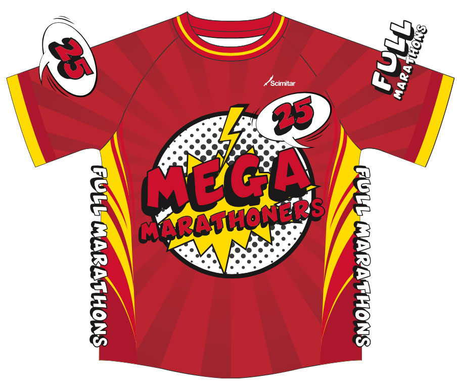Striking red Mega Marathoners Full Marathon Short Sleeved Shirt!